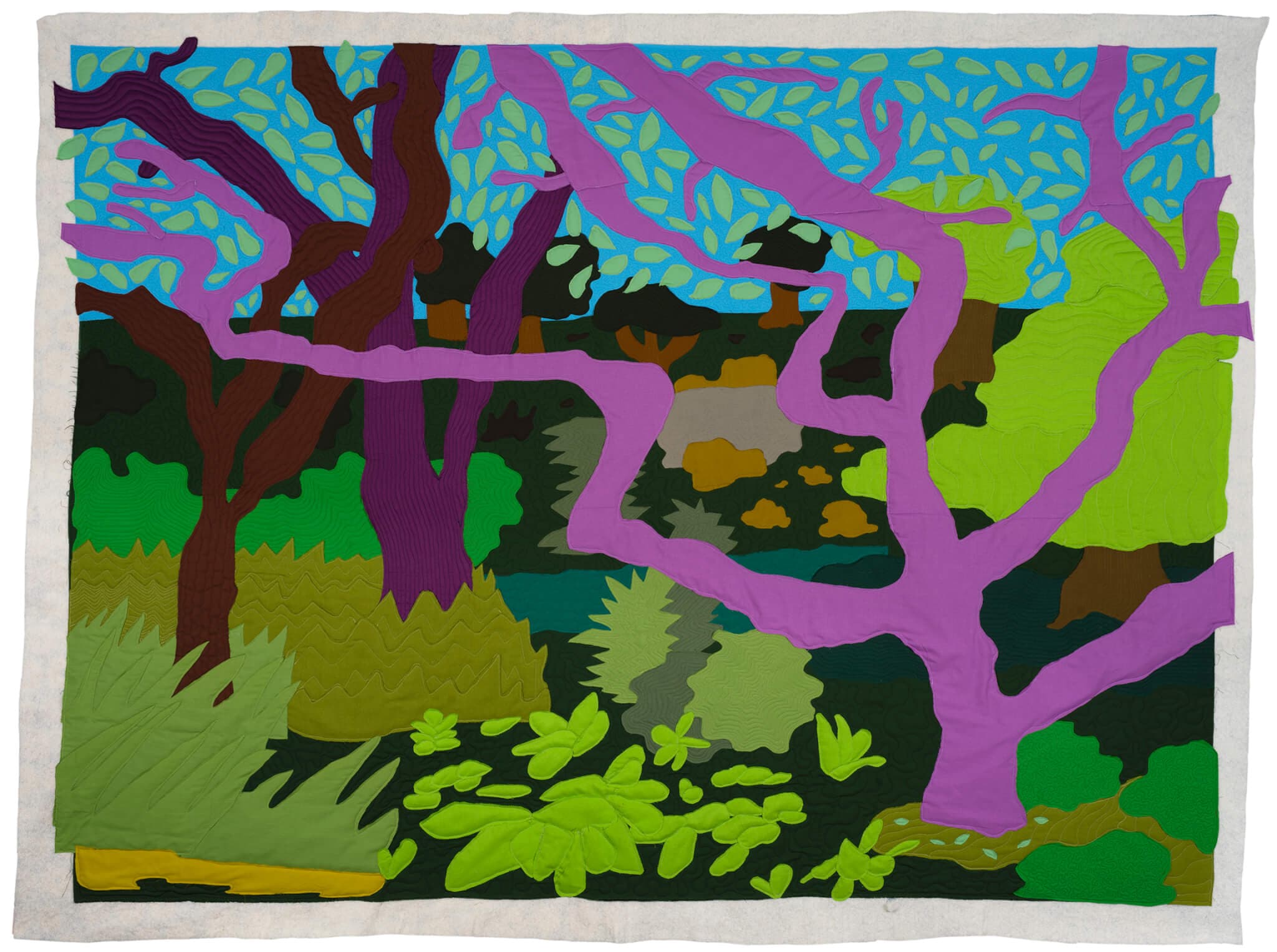 Michael Thorpe, camp atwood, 2021. Fabric, thread, and quilting cotton, 81.5″ x 63″. Collection of Jonathan Bush and Fay Rotenberg. Courtesy of Fuller Craft Museum.