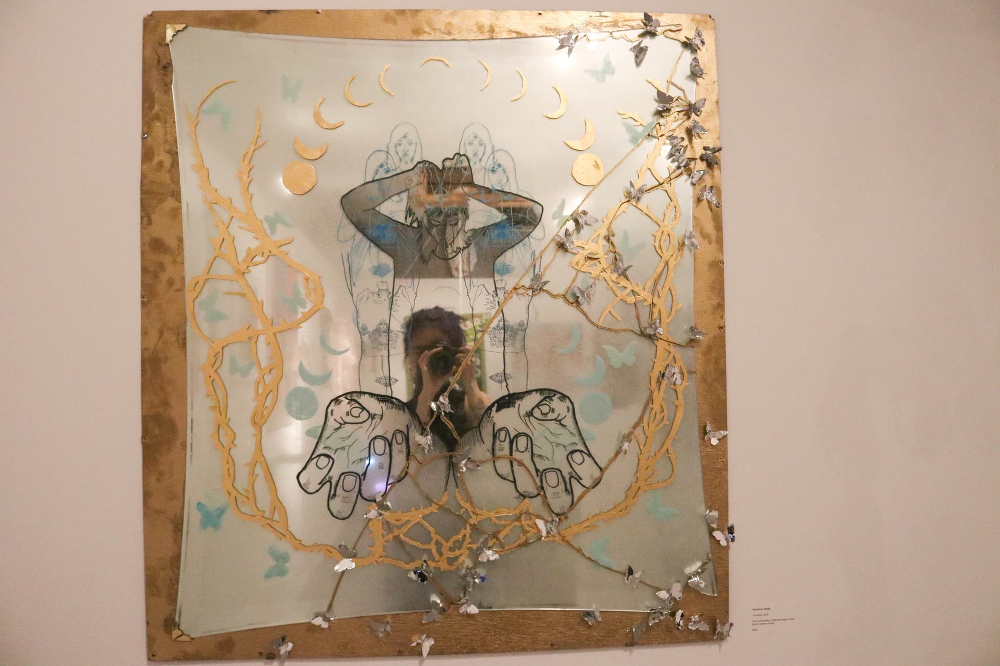 Ankana is not the only artist whose shrine sends a message about immigrants. Carolina Laredo’s Peruvian roots are incorporated into her shrine called “Insomnia” that focuses working through personal challenges like mental health. Laredo affirmed much of her work is drawn from personal experiences. A dark figure looking down stands in front of six figures and behind two hands. This imagery is painted on large mirror framed in gold. Gold moon phases and vines surround the dark figure, as do silver butterflies. Laredo shared that her shrine was born from an anxiety attack. “I had a really bad anxiety attack and it has a lot to do with the fact that I feel like when I go through anxiety, I go through a time of not understanding myself,” she said. “So the idea for the main figure, if you look at all six figures that are behind it, they are actually inter-looping. You can see the hand, the face, actually [interwoven] with each body part. I think that has a lot to do with other anxiety that I deal with. Having that center figure is when you are going through these things, you don’t have just one feeling, there are multiple feelings that are racing through you and you feel like you have multiple different types of personalities when you’re experiencing these anxieties.” The butterflies that surround the figure represent how immigrants are viewed as butterflies, Laredo said. “I was going through a lot of things with school and also politically, my family’s from an immigrant family so I wanted to have a conversation about immigration…I also wanted to talk about the idea like how immigrants are seen as butterflies. The transparency, the mylar shows you’re able to reflect yourself in it. No one besides actually indigenous people from this continent are people from here so I wanted to have that idea as well come through that.” While the butterflies represent movement, the hands painted in black are tied down by thorny vines. Laredo shared that, “to be able to grasp something and to be able to let go is a huge thing that I think in society we deal with. You also see the hands are wrapped with thorn-like things coming out of it. I wanted to show the idea that thorns, they’re not only something that tie you down, but also strengthen you. Even though these thorns are things in life are holding you, you’re able to release pains and anxieties.”