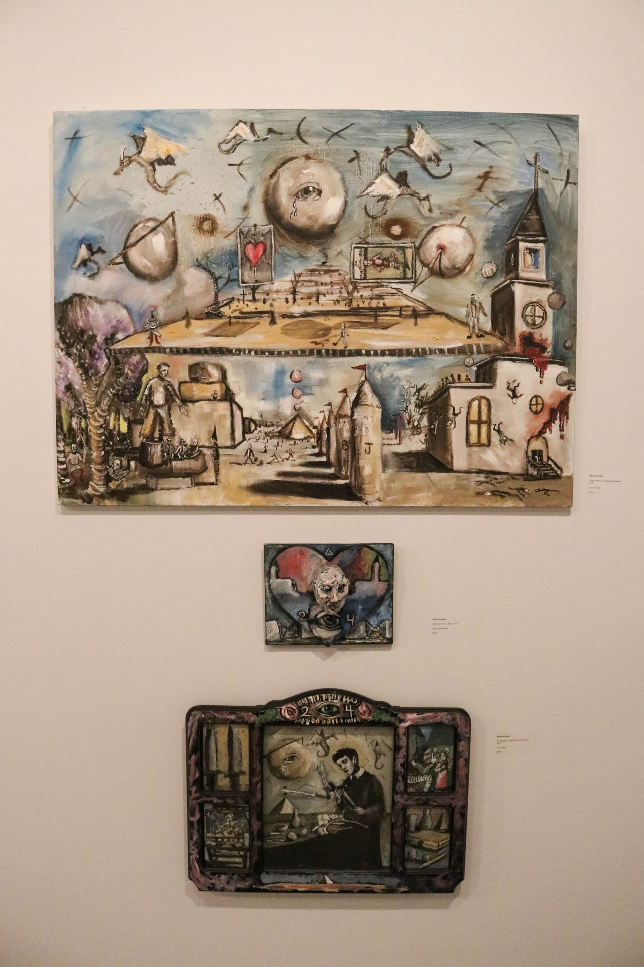 Growth is a theme also explored by Brian Huntress, whose shrine consists of three oil paintings with a dark palette. His work recalls his troubled childhood, but also re-appropriates and reclaims the aspects that brought him pain. “In those specific three pieces, I used a lot of Catholic imagery. Even some quasi Masonic stuff. I was raised Catholic. I was kind of indoctrinated with a lot of these beliefs at a young age, which I really do not hold anymore. I’m not a Catholic,” Huntress clarified. “In a lot of ways, through the church I was raised in and being around all these symbols, I was taught to hate myself. One of the first things I learned at a very young age was how to be ashamed of myself…I learned how to be ashamed, I learned how to hate, I learned how to alienate myself from others.” The shrines, like much of Huntress’ other work, are dark and often reflect a turbulent past. While some may want to ignore the past, Huntress remarked that those formative years taught him how to question and think critically, and were therefore valuable. “For me personally, the hatred, pain, and suffering that I’ve experienced was the very thing that made me me. I live with these things everyday but they’re not things that plague me or haunt me or destroy the way I live. They’ve absolutely colored, informed, and painted the way I interact with the rest of the world…These things have taught me how to scrutinize, how to be skeptical in a healthy way,” Huntress said. “I feel like at this point, a lot of times in my work, I lift a lot of symbolism from those places. I reappropriate it. I guess just reclaim a lot of it…those shrines are the things I was taught, things I unlearned, I guess reappropriating those things and trying to make them more palatable and beautiful and present them in a way that helps me grow as a person and understand myself more.”