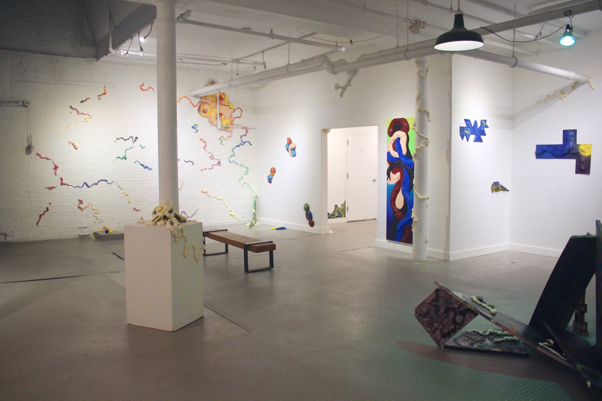 In her first solo exhibition, “Wandering Be-ing” at Distillery Gallery, Sunny Moxin Chen presents paintings, textile works, site-specific installations, and sculptural assemblages that reveal a state of impermanence. For Chen, who has lived in Moscow, Beijing, and San Jose, and recently graduated from Boston University’s MFA program, home is a movable point. Moving this point leaves a trail of residue, a leaking impression of self that exchanges, absorbs, and expands when drifting and discovering one’s position in the world. Chen conveys this nomadic path and its ontological ripples through gesture and material. Paint layers into three-dimensional globs that meander through the space, like footprints along a journey. The gallery itself becomes its own kind of border-less map that captures the artist’s transient presence.