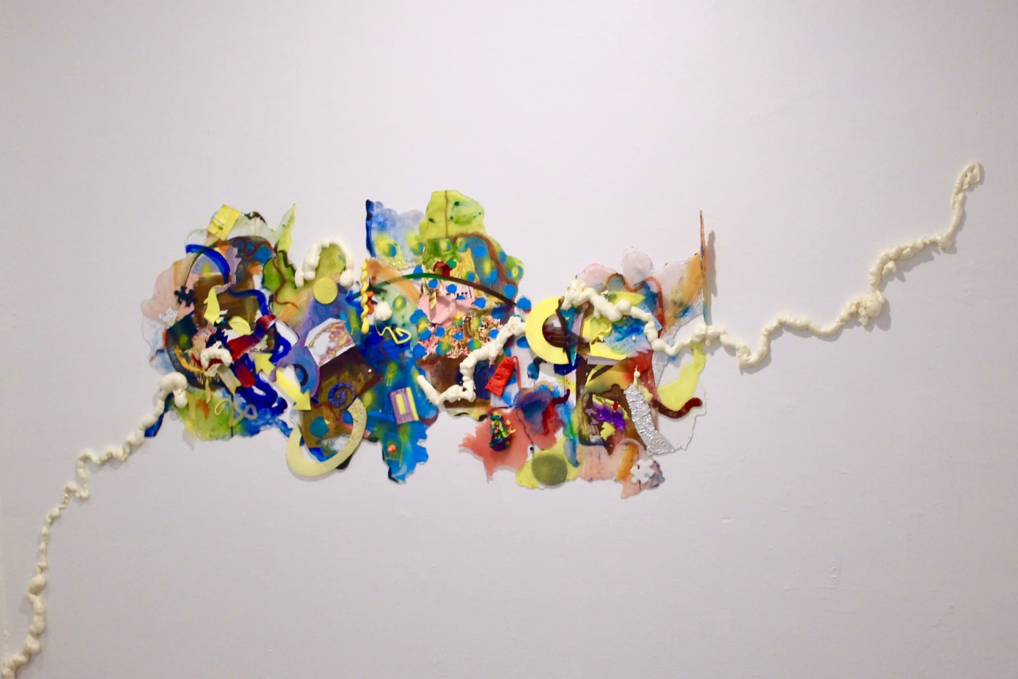 Two little houses—one blue and one yellow—sit snuggly atop a short step. Behind them, drops of paint globs scatter and create a path that leads to a wall named Wandering Be-ing (2022). This titular installation is a keystone of the show. Multicolored traces of acrylic and house paint serpentine freely across the gallery’s white brick walls. The composition is reminiscent of a deconstructed world map—the squiggles of borders are broken, disconnected and permeable. Chen choreographs a wandering through color gradients; neon green blurs into sky blue blurs into midnight violet. Two pools—one yellow, one blue—sit nearby. The two houses and the two pools are close but not technically connected, yet their corresponding color and proximity implies a chord of connection. Here, Chen displays the possibilities of embodiment, from structured and identifiable units to formless puddles. She depicts, perhaps, how humans can transform into new shapes and identities, yet maintain some enduring soul quality. In the top right corner, a sign of twisting spirals and arrows reads “Money cannot buy you love.” This is one of the only instances of text within the show, so it stands out. Here, she reveals lessons from her transient experience, the importance of holding a spirit in motion, as opposed to physical objects.