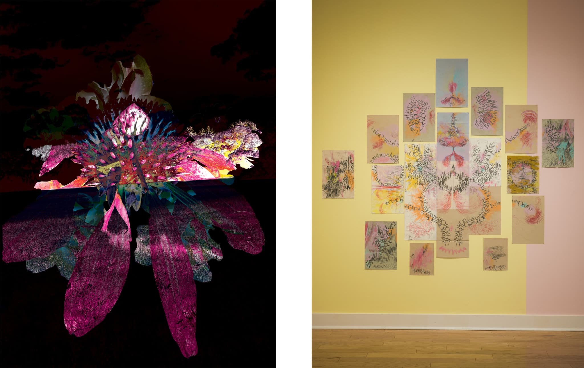 Works by artists Cicely Carew and Gabriel Sosa in their separate solo shows at Fitchburg Art Museum. Left: Cicely Carew, Light Up, 2022. Digital art collage. Photo courtesy of the artist Right: Gabriel Sosa, Open to interpretation, 2022. Graphite, colored pencil, and oil pastel on paper. Photo by Charles Sternaimolo courtesy of Fitchburg Art Museum.