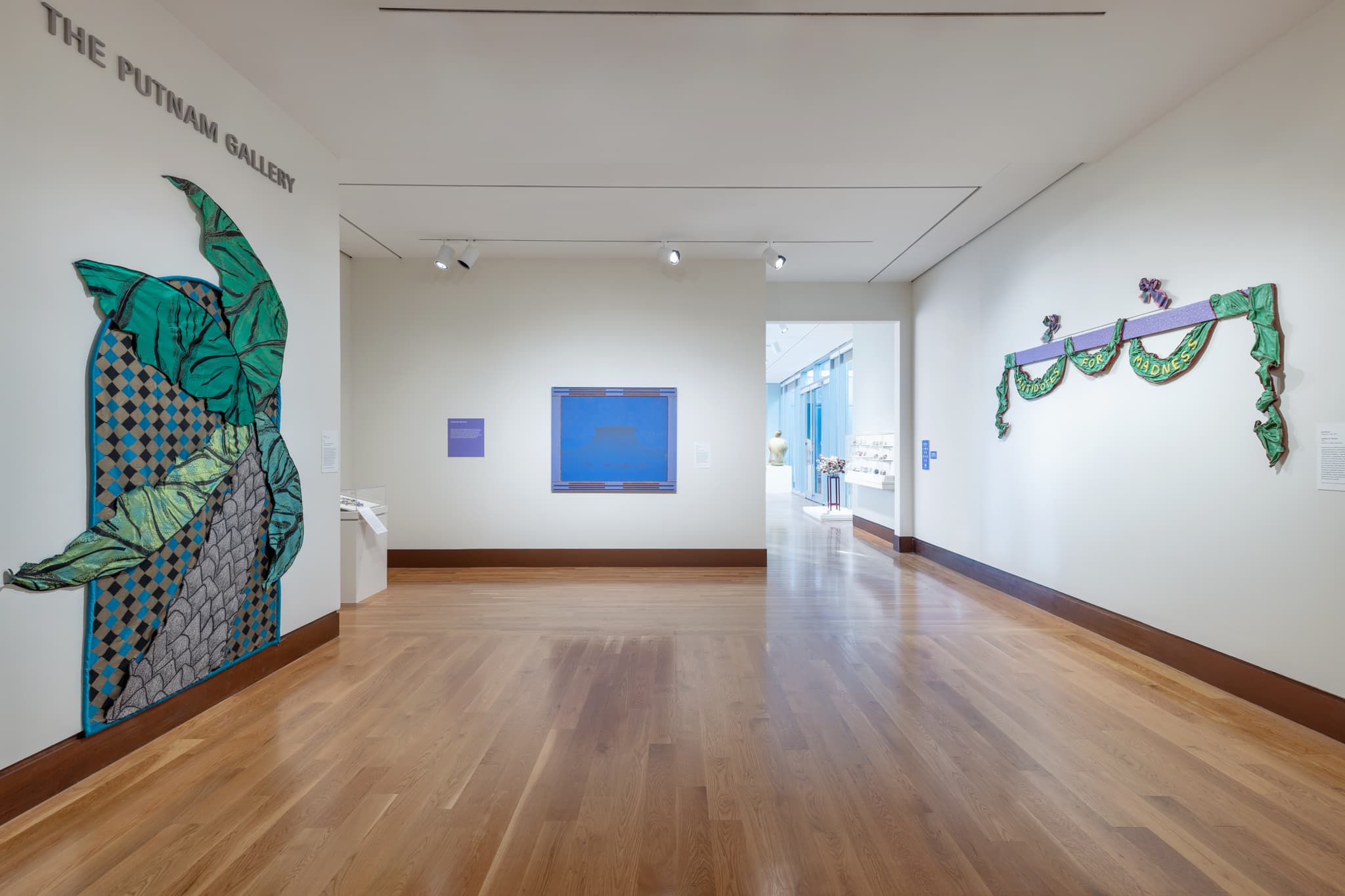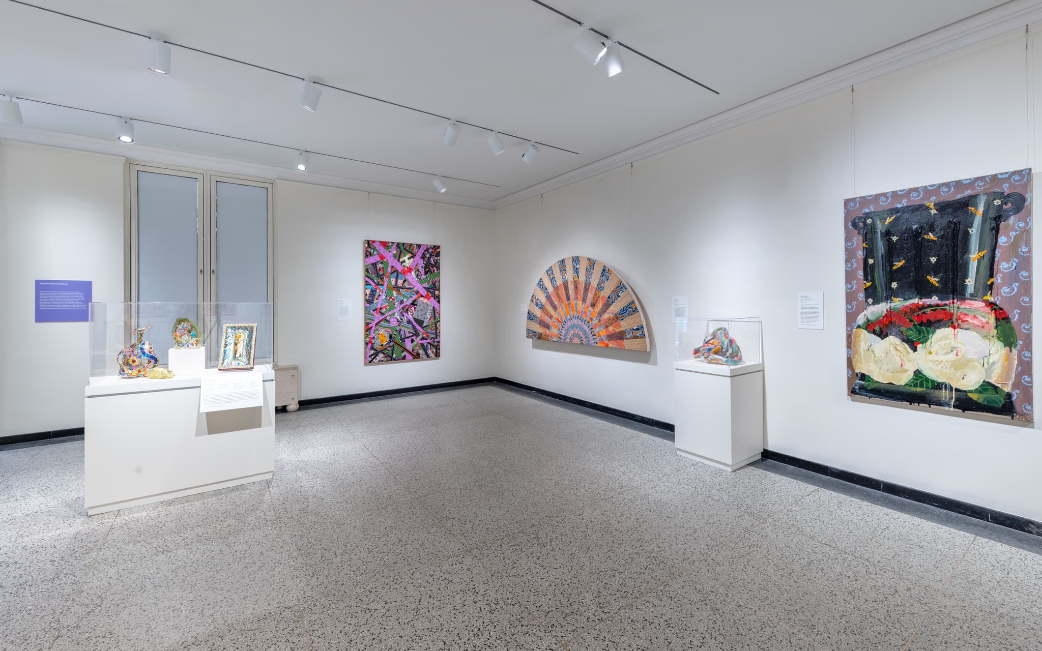 (left) Ned Smyth, Dina, 1979. (right) Ree Morton, Antidotes for Madness, 1975. Installation view, “Embellish Me: Works from the Collection of Norma Canelas Roth and William Roth,” Currier Museum of Art, 2026. Photo by Morgan Karanasios. Courtesy of the Currier Museum of Art.