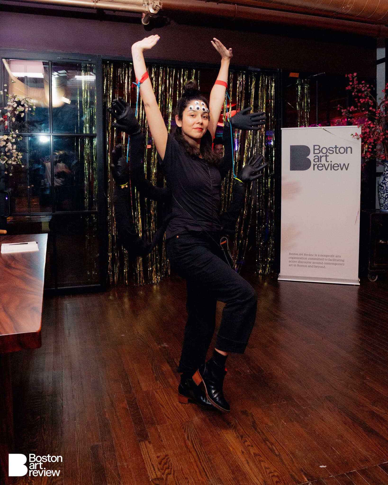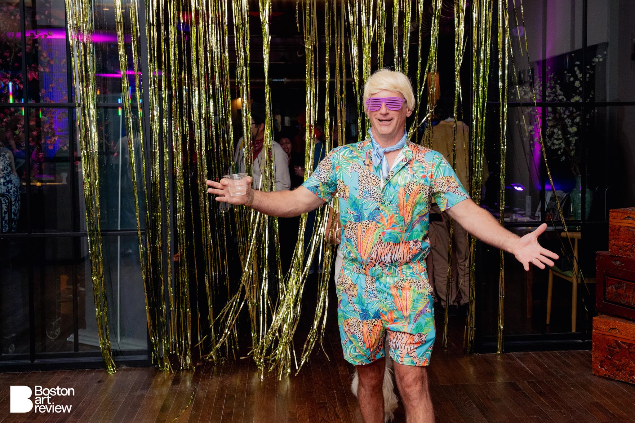 The entrance to the Boston Art Review Issue 13 launch party adorned with metallic streamers and backlit by an array of colorful lights.
