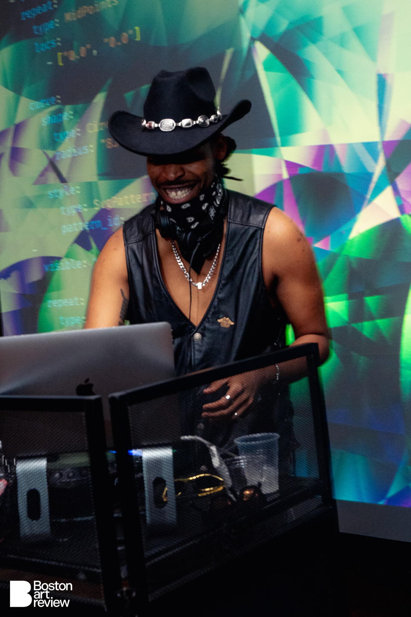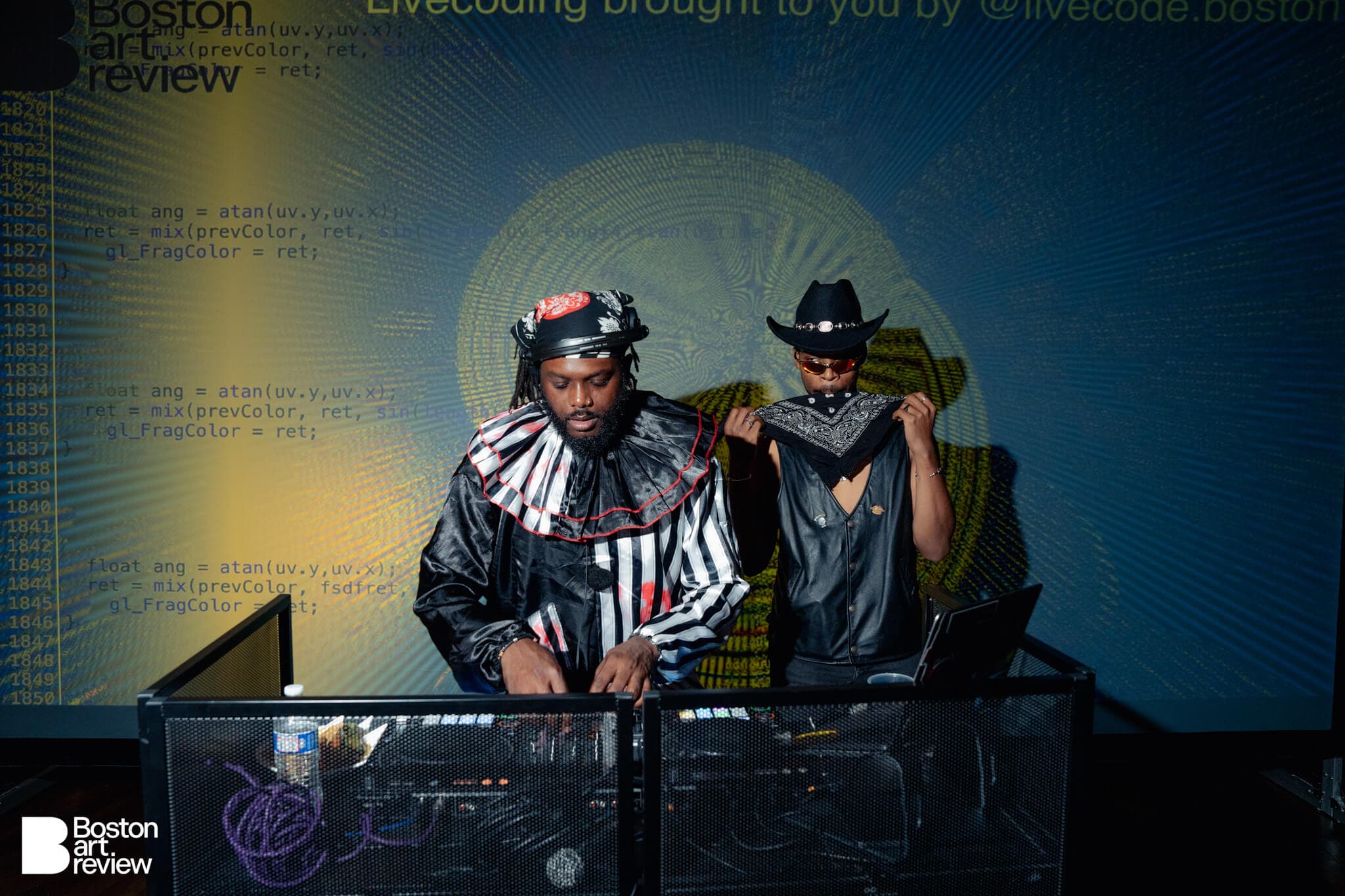 During the party, there were live coding video performances by Boston Tech Poetics (Char Stiles, Jessica Stringham, Blktrmlne, Shawn Toubeau, and Jame Coyne.) Exhibited works by Allison Tanenhaus, Supreetha K, and Rasita Kartarharja adorned the room while lighting by Jim Manning lit up the dance floor.