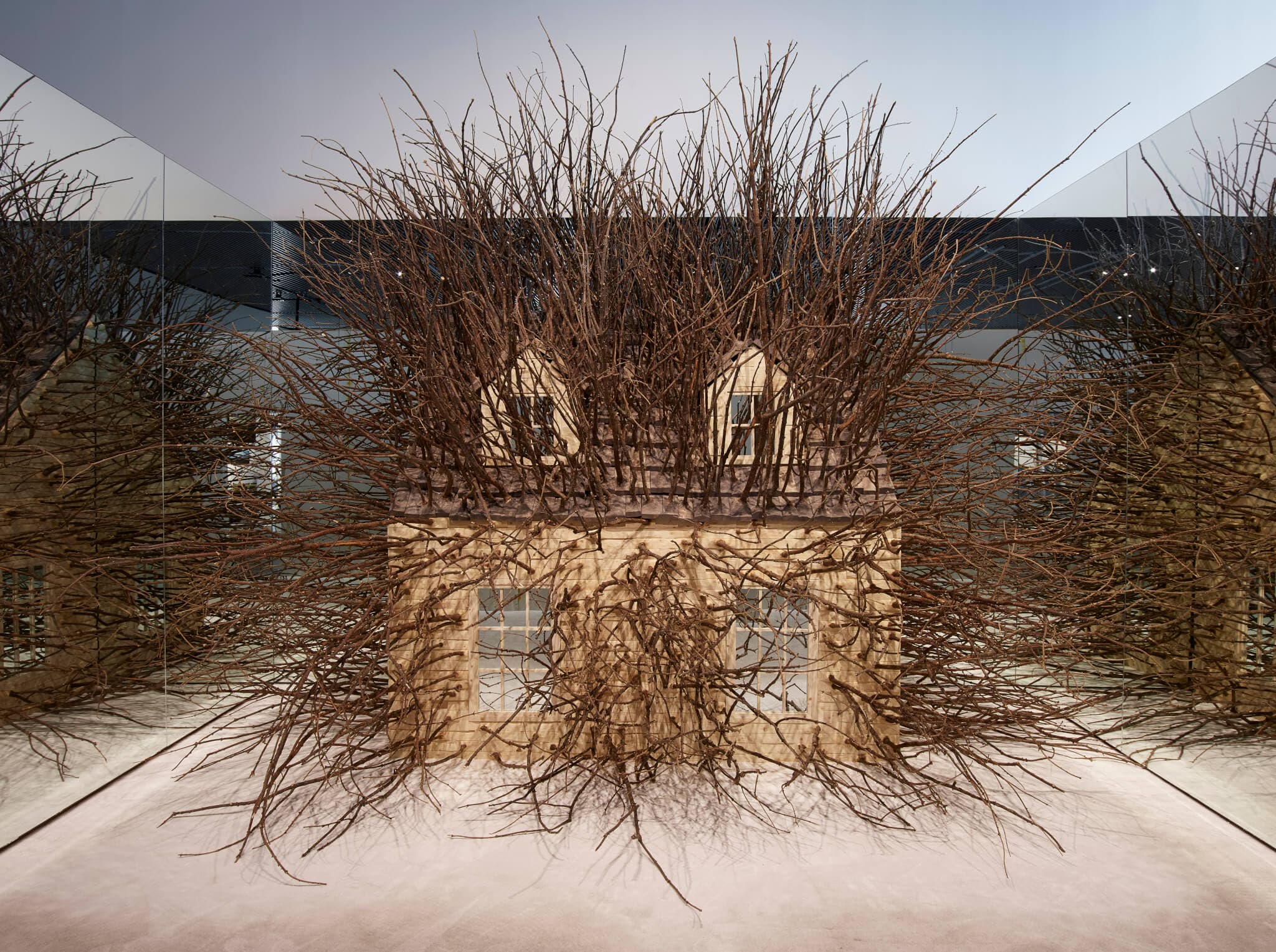 Hugh Hayden, Hedges, 2019. Sculpted wood, lumber, hardware, mirror, and carpet. 144 x 208 x 208 in. (365.8 x 528.3 x 528.3 cm). © Hugh Hayden; Courtesy The Shed Open Call and Lisson Gallery. Photo courtesy of Mark Waldhauser.