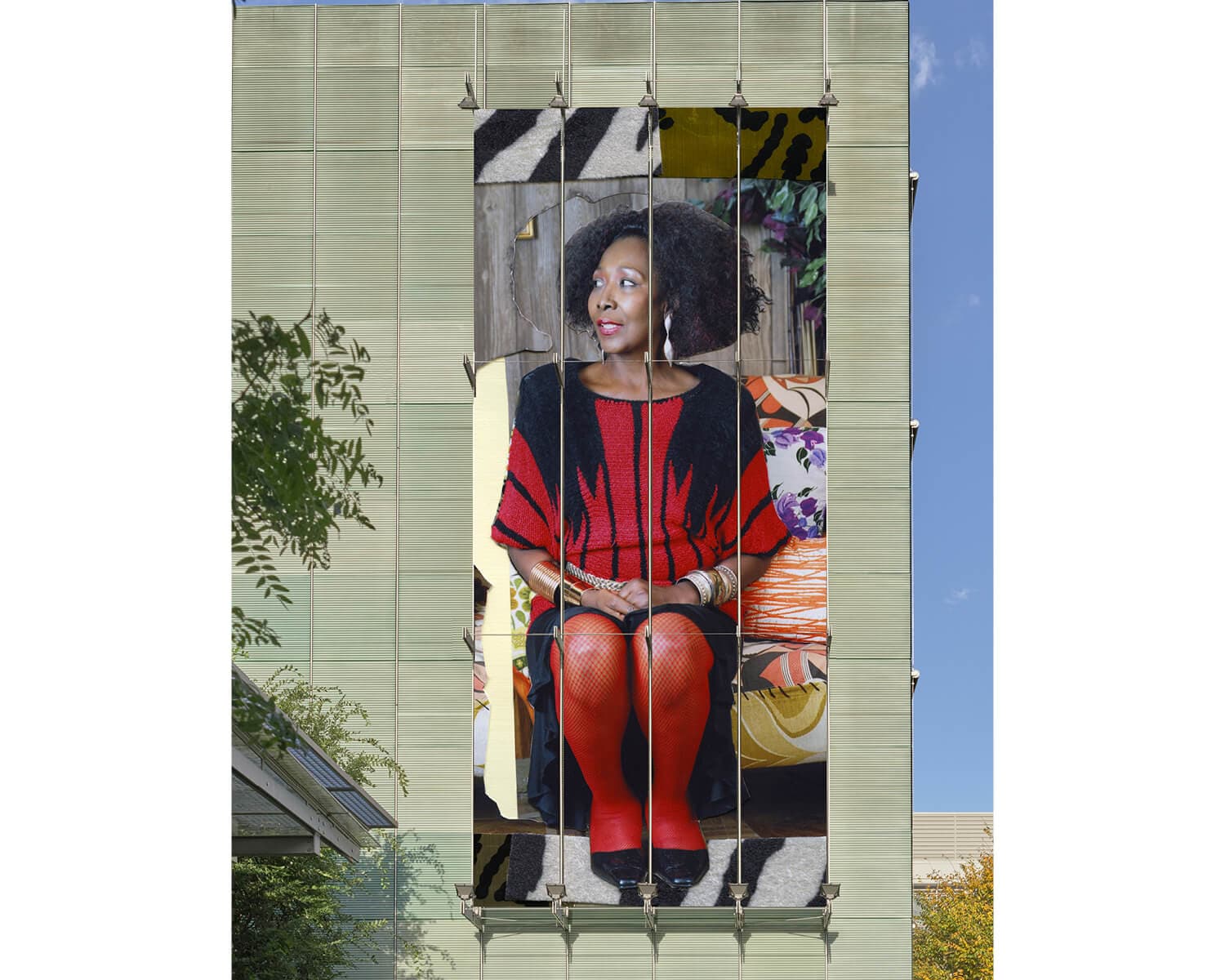 With colossal gold cuff bracelets from wrist to elbow, bright red fishnet stockings and a red lipgloss to match, big curly hair, and bone structure that is simply unmatched, Sandra Bush is a beauty and she knows it! Beginning this fall, Mickalene Thomas’s Sandra, She’s a Beauty (2009)—a photo collage of the artist’s mother and early muse—will grace the Anne H. Fitzpatrick façade at the Gardner Museum. Reminiscent of the Gardner’s Édouard Manet portrait of his own mother, Thomas’s piece refers to the Western canon of portraiture while challenging it significantly. She floods the frame with color and reverence. Perfectly poised on a couch of colorful mixed fabrics, Sandra smiles brightly in a symmetrical red and black ensemble. Thomas plays up the bold furniture patterns using collage to frame her beloved sitter. Visitors to the museum will be ushered in beneath Sandra’s radiance.