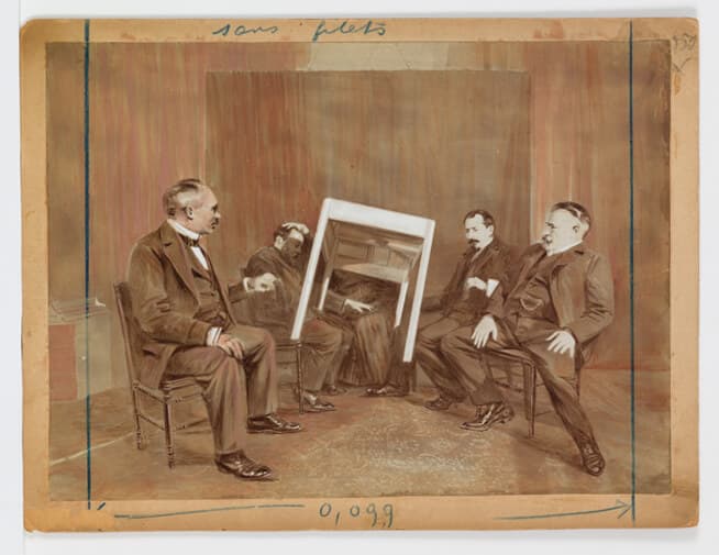 Attributed to Jules Courtier, Eusapia Palladino levitating a table during a séance “without threads,” about 1907–9. Retouched photograph. Collection of Tony Oursler. Photo courtesy of Oursler Studio.