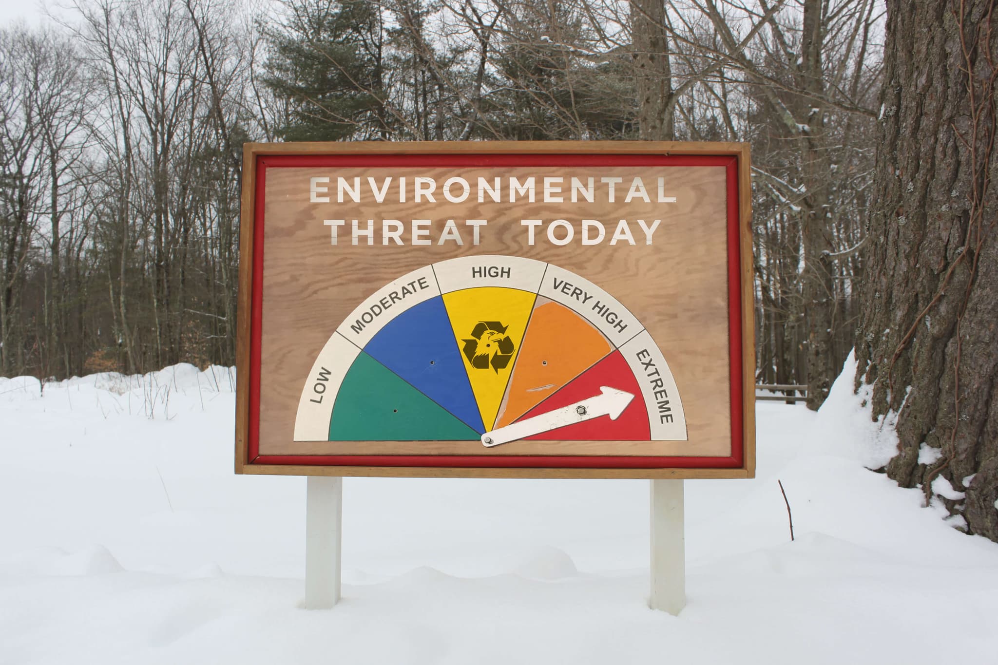 David Buckley Borden, “Environmental Threat Level Sign,” design study for installation, recycled specimen box, fence posts, dowels, acrylic, vinyl, and hardware, .25 x 1.5 x 3 feet, 2017.
