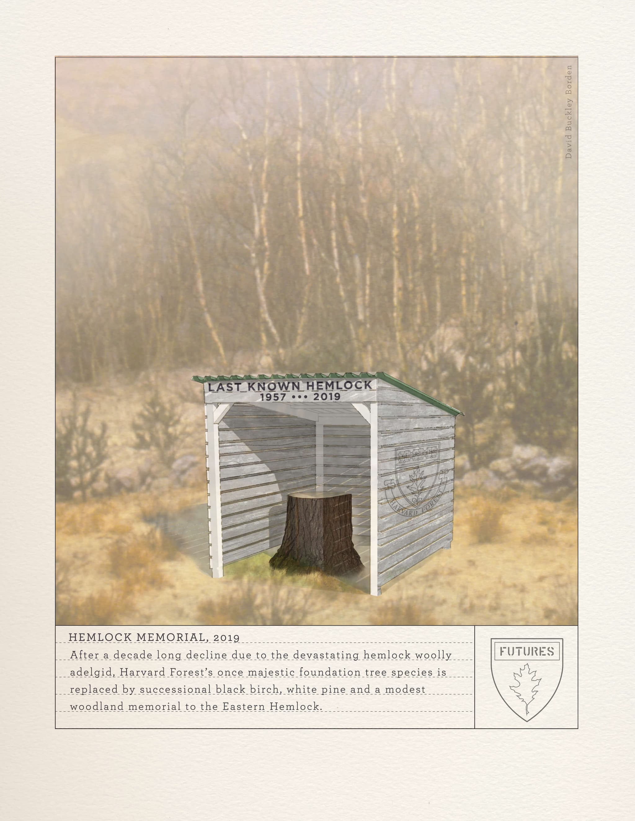The Harvard Forest is often referred to as “The Wired Forest” for its expansive data collection systems, wide-ranging Internet connectivity, and several viewing towers. Prior to applying to the fellowship, Borden spent several months workshopping an appropriately scientific art proposal. Struck by the the juxtaposition of wild woodlands and high level research, Borden landed on a project that would naturally combine the natural phenomena of the environment with the prevailing research at hand. During the first two months of the fellowship, Borden created very little, instead versing himself in the dynamics of the forest. Working closely with Ellison, they began to create a narrative about the wave of death occurring right in front of them. With little time left to mourn, Borden created the “Hemlock Hospice” as a space to simultaneously grieve, learn, and effect change.