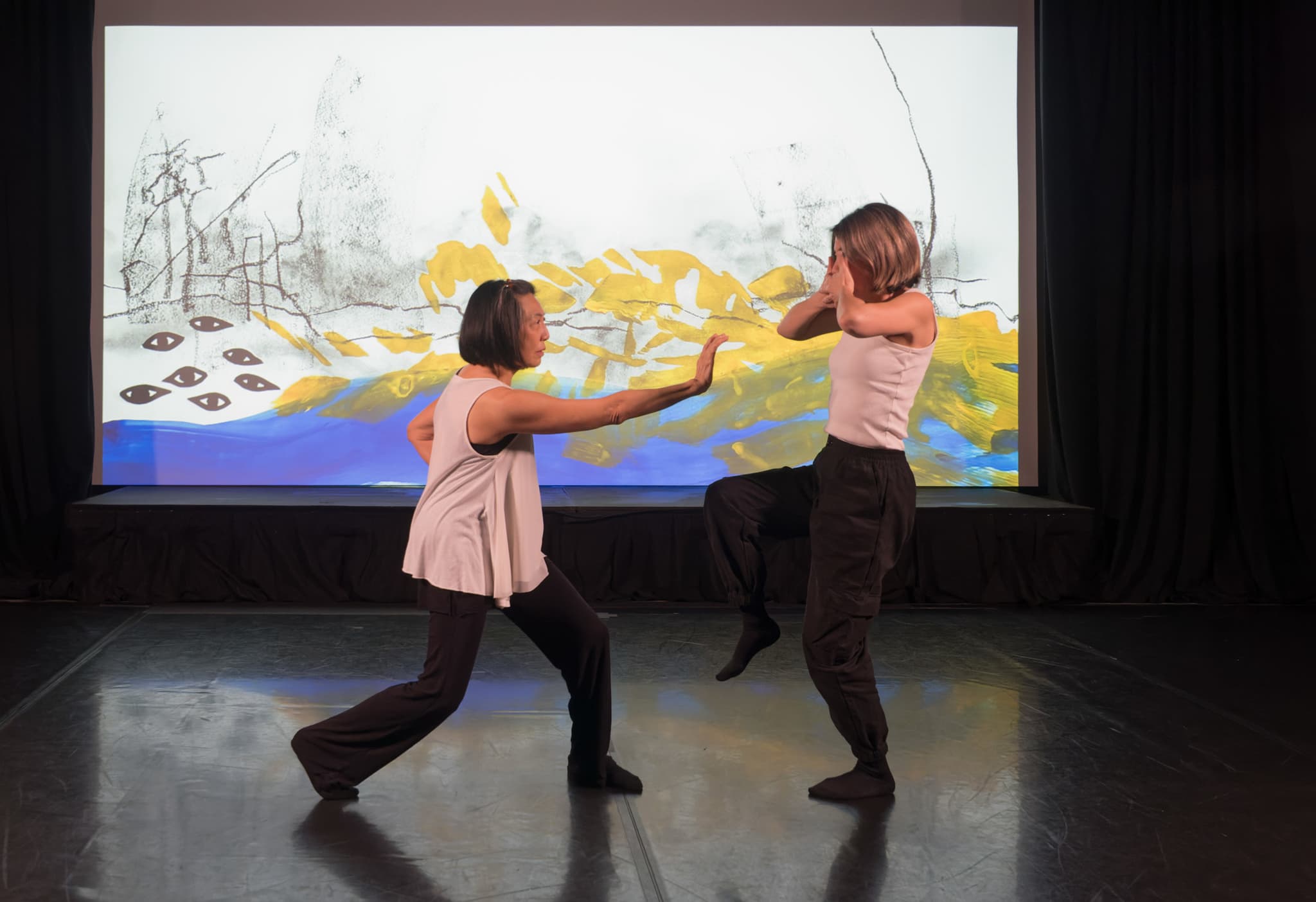 Act three involves a combination of dance, animation, and storytelling. Using an audio overlay, short phrases, said together or separately, and stories give context to their dance movements and the animation, projected behind them on a white screen. The viewers have some background to both Kim and Chan and are now watching them in community with each other through their physical interactions and the mixing of animated images. Every so often, you can hear a series of notes played on a gayageum. During this act, there is a shift towards connection. The storyteller’s dance movements are done in two parts with the other dancer. We see them at times as distinct, at one point in the dark under spotlights, and together, through touch, leaning, collective dancing, and linking arms. They invite us: “Come join our circle.” In the finale, a video of a moon being painted is projected while the women dance, still together yet moving as individuals.