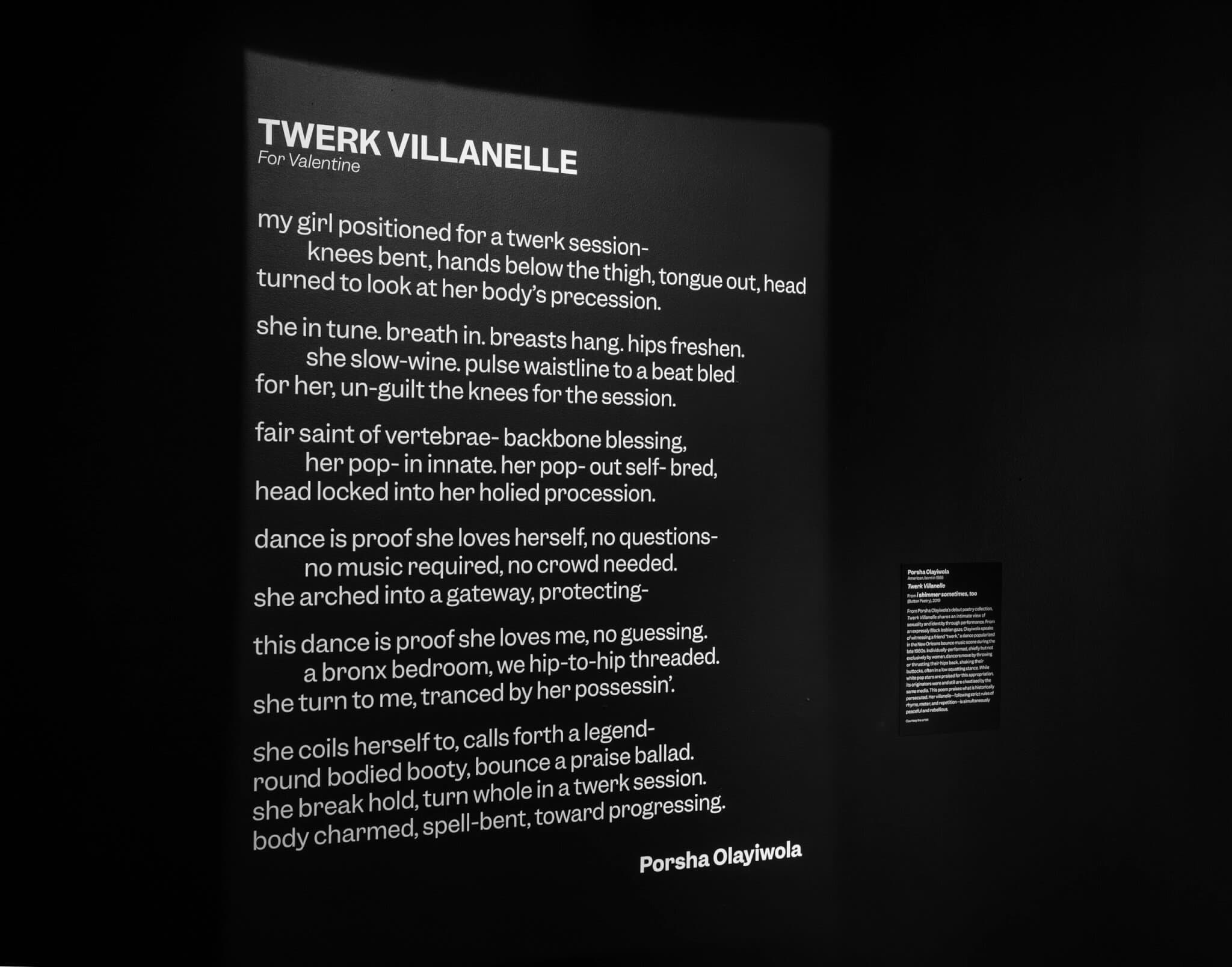 Porsha Olayiwola, “Twerk Villanelle,” installation view, 2019. Installation view, “Four Womxn: New Musings on Blackness,” on view at the Museum of Fine Arts, Boston, through November 17, 2024. © Porsha Olayiwola Smith. Photo courtesy of Museum of Fine Arts, Boston.