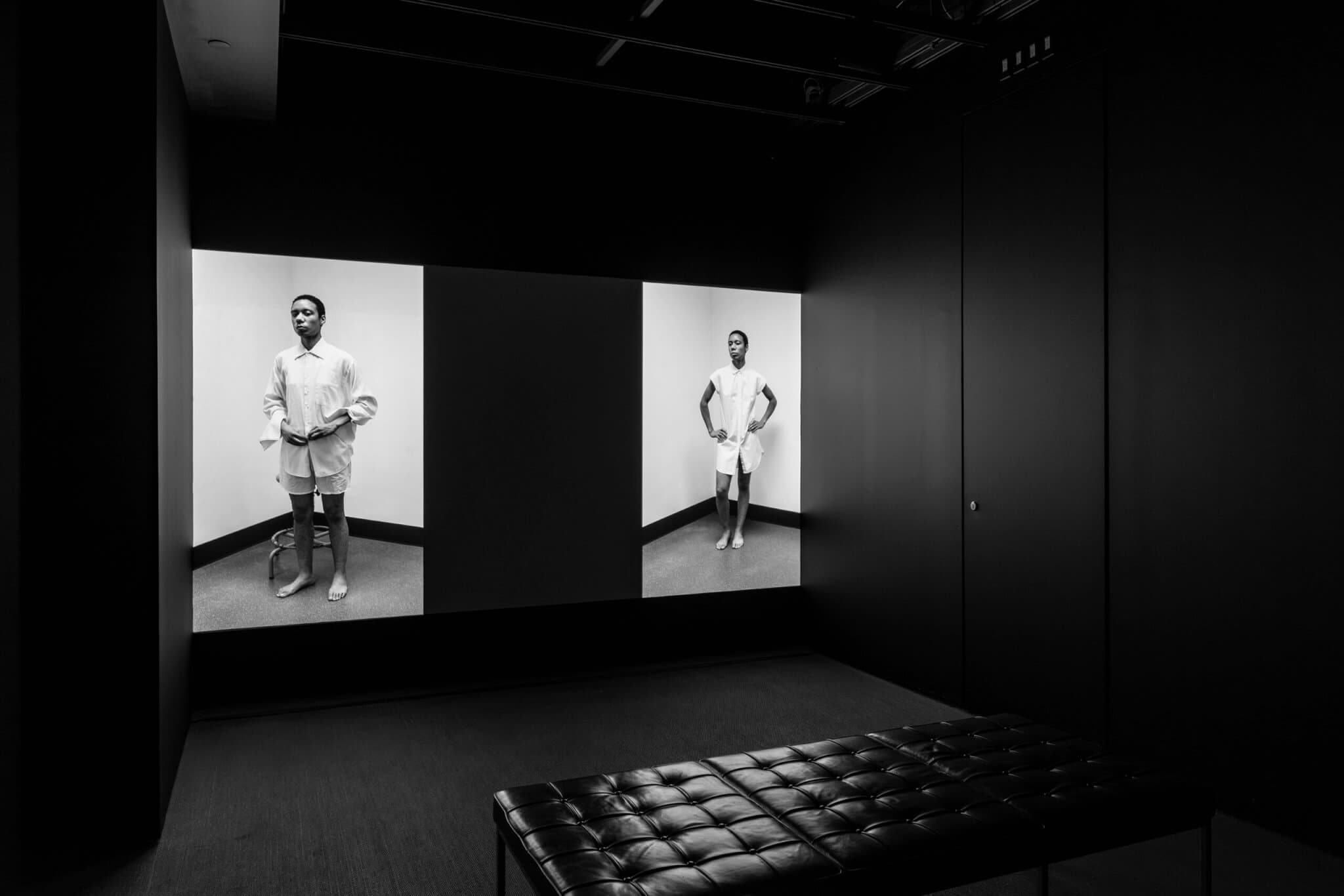 Like Gay and LeSeur, Smith challenges the viewer’s gaze in Untitled no. 000 (2020), taking us on a journey of identity, power, and Black gender expression through a simple white cotton dress shirt. Influenced by the aesthetics and postures of nineteenth-century portraiture, Smith queerly interrogates constructs of respectability, class, and race through her embodied reinterpretations of feminine and masculine representations on three video channels. The work oscillates between perspectives of her face, torso, and full body as the artist buttons and unbuttons various iterations of the cotton garment. She wears the shirt as an adornment, carrying with her histories of the cotton economy during chattel slavery; the exploitation of Black bodies sustained the wealthy lives of cotton merchants and plantation owners. As Smith brings forth the white cotton dress shirt’s ability to function as a code of hierarchy and control, her androgynous embodiment also makes this piece a statement to queer culture and the role of fashion in Black queer expression. The shirt marks a formation of Blackness outside inventions of structure and a balancing act of race, gender, and sexuality grounded in the politics of looking. In each video clip, Smith stares starkly at the audience, reclaiming what it means for the Black female spectator to gaze back.