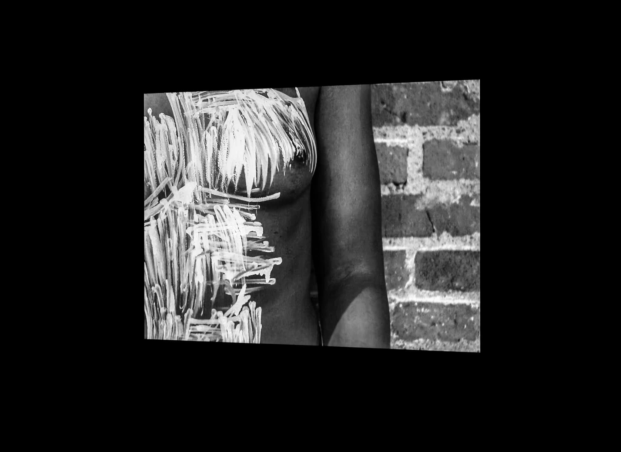 As sparse mentions of “fields,” “crooked”-ness, and “off-kilter” sight audibly illuminate the exhibition’s background, LeSeur, a performance artist, draws viewers into an intrusive act of watching. In White Out (2018), LeSeur addresses the erasure of queer Black womanhood in feminist spaces that are predominantly white, cisgender, and heterosexual. Inverting the performance of blackface, LeSeur uses Wite-Out—the white correction fluid—to cover herself from the top of her exposed breast to the landscape of her abdomen. LeSeur marks herself with streaky lines of white, an attempt to hide and sanitize her identity at the hands of a white gaze. Her jagged, repeated movements provide a visual echo of “crooked images”: assimilation as a trauma response to the intensity of white eyes, as a means of remedying the “crooked room.” Yet, the contours and shades of LeSeur’s dark skin prevent the white liquid from settling in as opaque. The fourteen-minute video presents the Black female body as a fugitive entity holding the viewer captive; an entity too long sexualized, commodified, and discarded. It is the viewer’s privilege to watch LeSeur’s “White Out” from beginning to end, to be allowed to witness a queer Black body in liminal space.