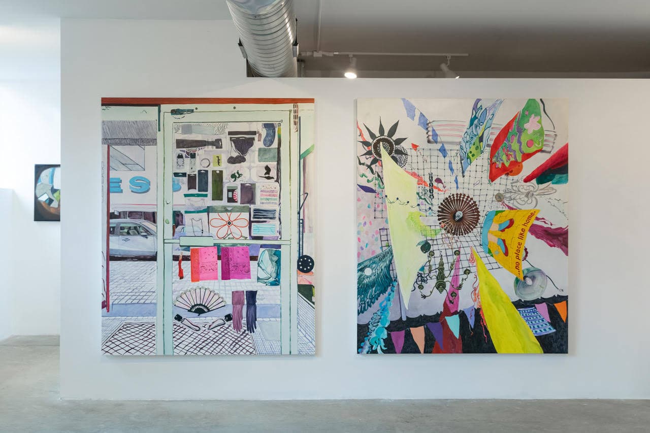 (left) Lizzie Zelter, General Haus, 2023. Oil on canvas. 72 x 60 x 1½ inches. (right) Lizzie Zelter, The Twister, 2023. Oil on canvas. 72 x 60 x 1½ inches. Installation view, “What’s New In Still Life, Portrait, and Landscape,” LaiSun Keane, Boston. Courtesy of LaiSun Keane. Photo by Dan Watkins.