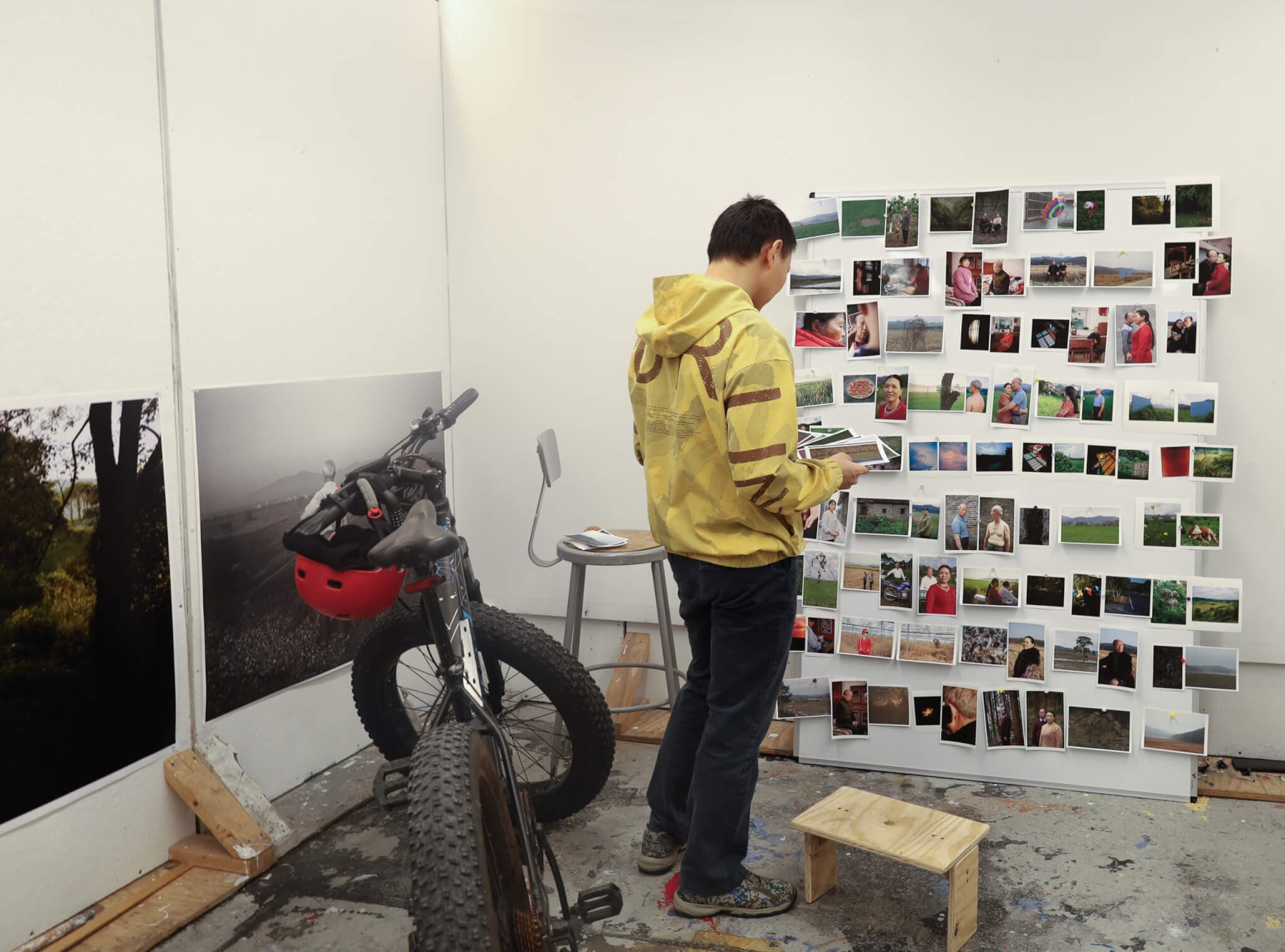Next to Afkhami’s studio inside the Kennedy building at MassArt, Andrew Zou, also a second-year MassArt student, is working on a chronological series of photographs. In Zou’s To Love, To Remember, seasons provide the backdrop for images of Zou’s parents. Shot from 2020 to 2024, these photographs portray the annual transitions in Jiangxi Province, China. In summer, Zou’s parents shed their layers. In winter, they gain them back.