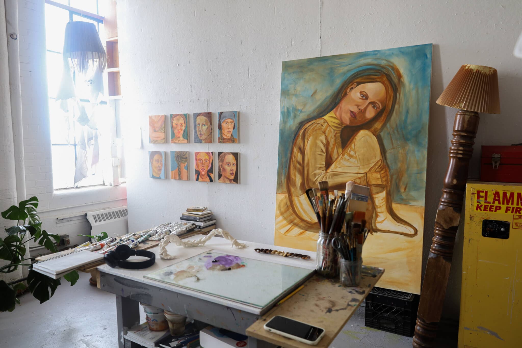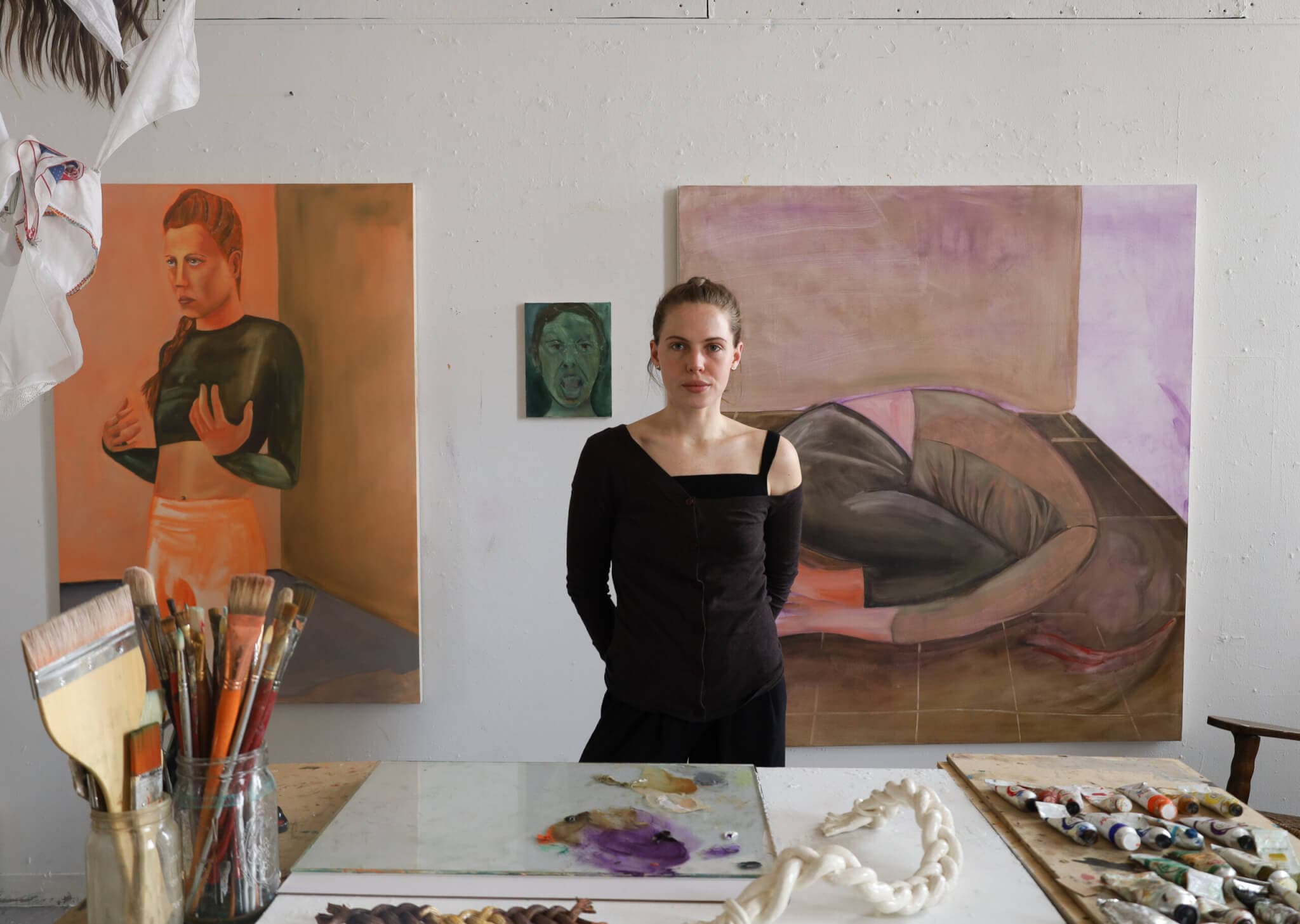 Scout Curtin, a first-year painting student at Boston University, stands before her work. Curtin’s studio includes oil paintings of bodies in motion and her braided sculpture piece (pictured on her desk). Photo by Yoko Zhu.