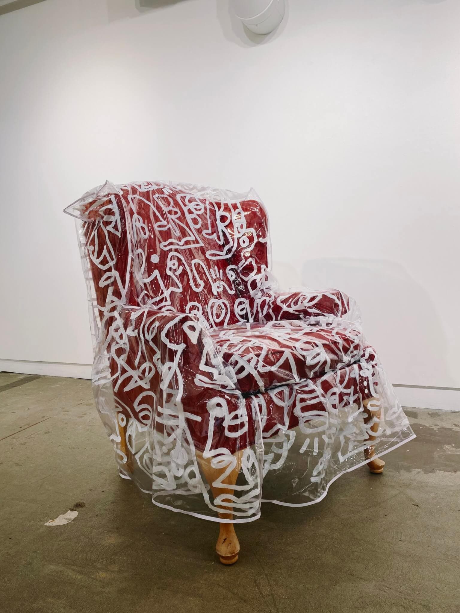 Ryan Horton, Saving Face, 2024. Krink marker on plastic over a plush chair. Ryan Horton, “Ego & Insecurities,” installation view, Piano Craft Gallery, Boston, 2024. Photo by Ryan Horton. Courtesy of the artist.