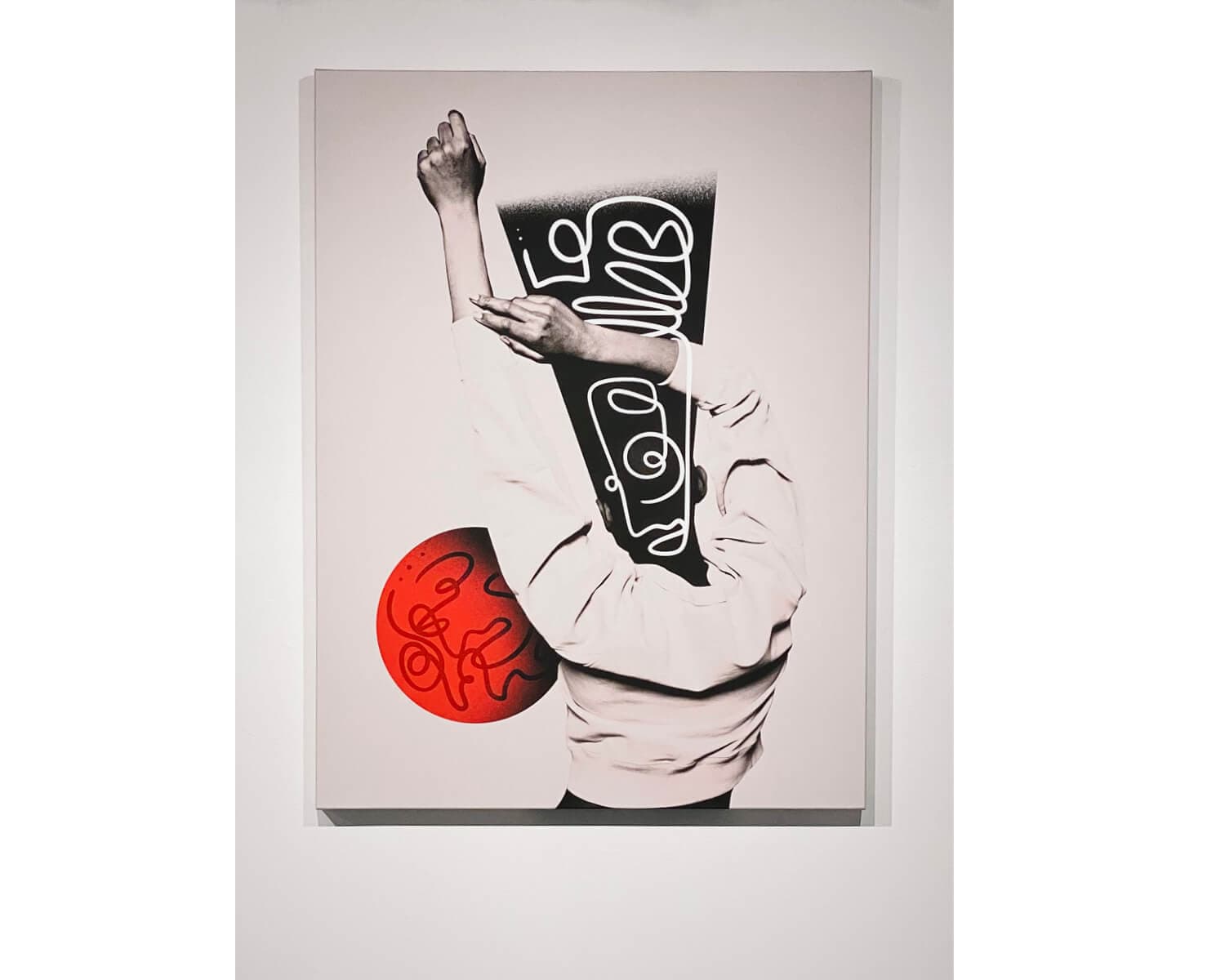 Horton came to Boston to earn his master’s degree in architecture from Northeastern University. In conversation with fellow local artist Jamaal Eversley, Horton describes single-line drawing and digital collage as his “one-two punch”—both of which are amply represented throughout the exhibition. Round and rectangular canvases ranging from 12” x 12” to 48” x 60” hang in the gallery alongside three three-dimensional installations. Vibrant red orbs recur throughout the show illustrating the intrepid ego, offsetting abstract line drawings symbolic of diffidence and the artist’s tendency toward overthinking. At times, however, these drawings offer assurance where a continuous line connects myriad faces emblematic of community.