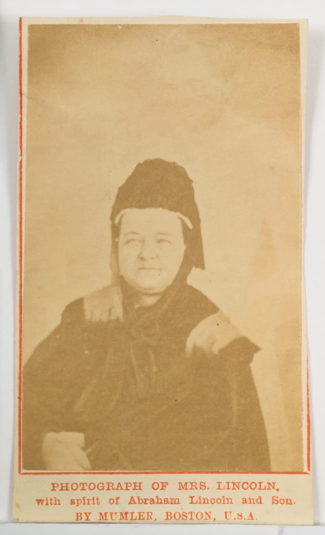 William H. Mumler, Photograph of Mrs. Lincoln with spirit of Abraham Lincoln and Son, 1872. Albumen print. Collection of Tony Oursler. Photo courtesy of Oursler Studio and Peabody Essex Museum.