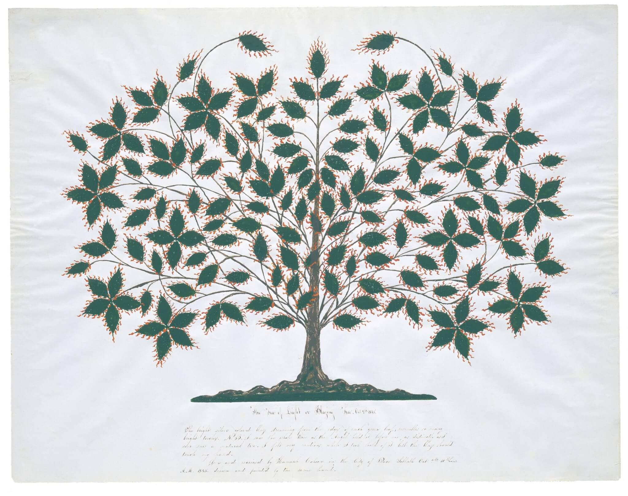 Hannah Cohoon, The Tree of Light or Blazing Tree, 1845. Ink and watercolor. Approximately 18 x 22 inches. Courtesy of Hancock Shaker Village.
