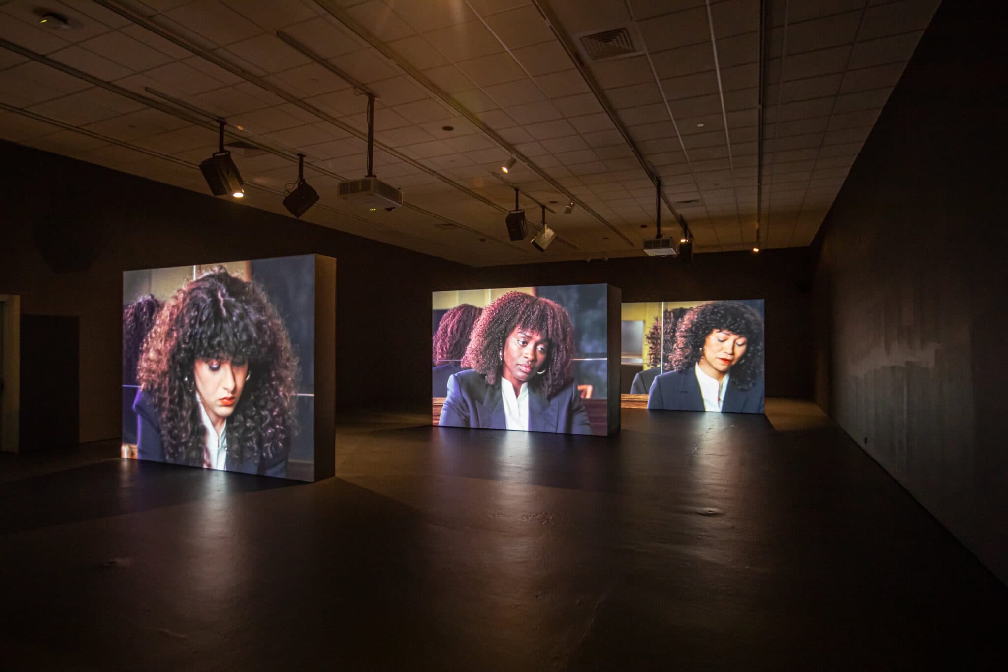 Also, there are the reflections of the projections. So literally on Manal’s back is Aïssa’s reflection—or you could say on Aïssa’s reflection is Manal’s projection. You can see in the ordering of screens how history is moving from Manal to Isabel in the correct chronological timeline. But then that timeline is confused by also reflecting them on the mirrored backs. I was thinking about fragmentation and distortion as another vantage point. Like, what is the difference between looking at Aïssa projected purely and Aïssa that through a grid? It becomes diagnostic and a little bit trappy.
