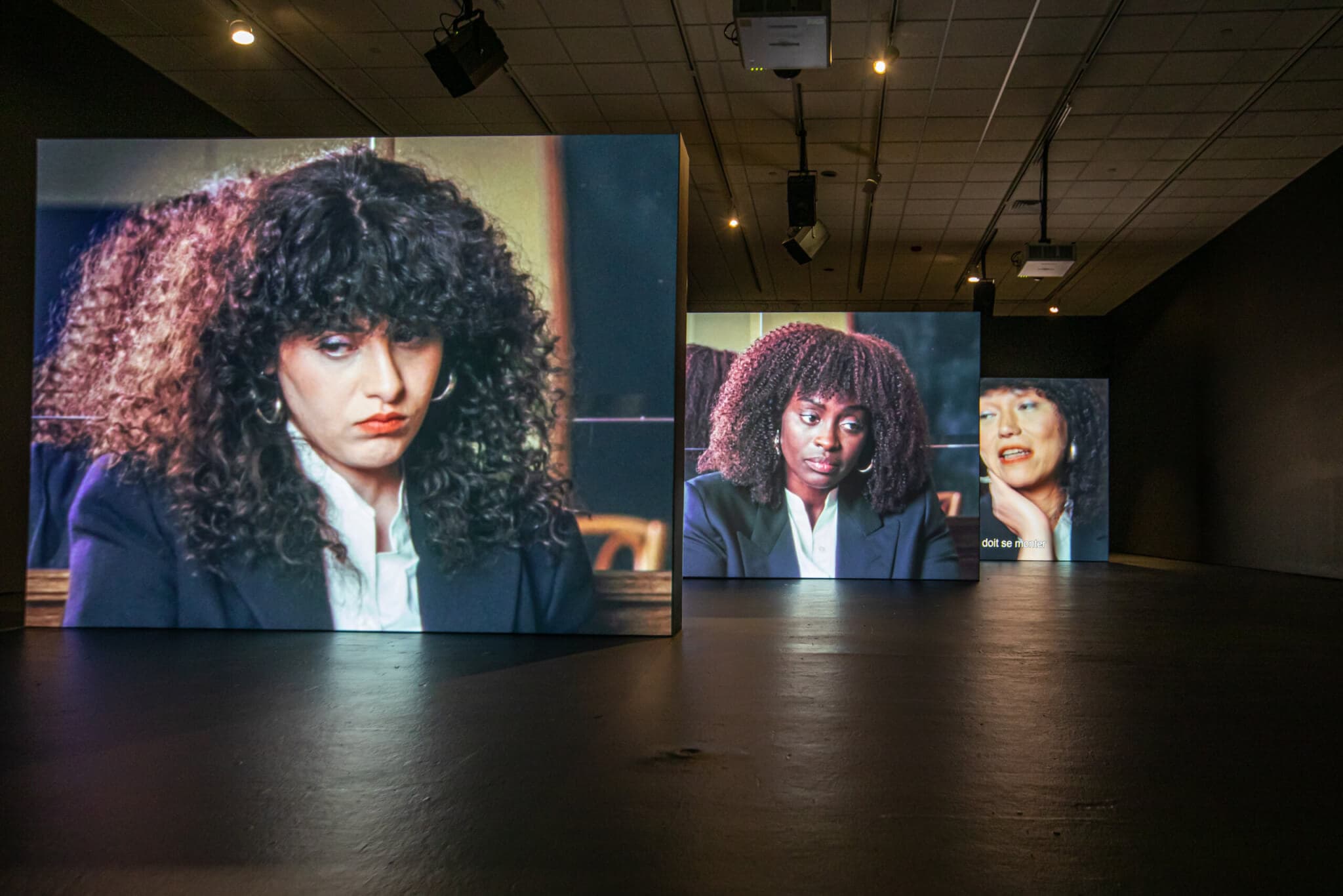 And then, because Isabel’s behind Aïssa and Aïssa’s behind Manal, their sound comes from the speakers that are in front of them. And that’s why there’s so many speakers, so that when you walk between Manal and Aïssa and Manal is speaking, you feel Manal right there in front of Aïssa, not far away.