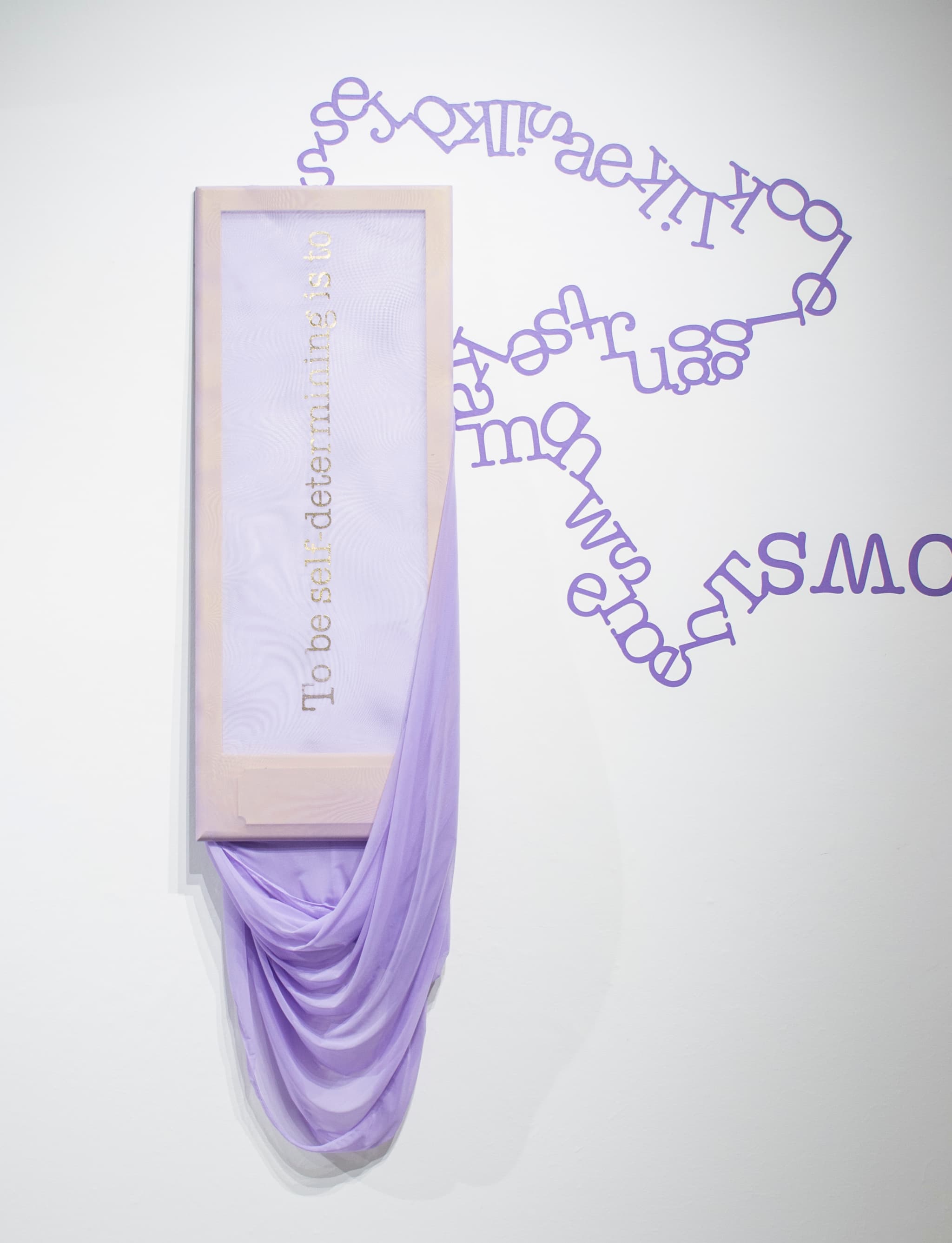 Moving through the exhibition space, the overturned text on the walls continues to transform. At one point, the text is becomes entirely jumbled—barely legible as it is crammed inside a wooden frame and draped in lavender colored fabric. An audio poem, written by poet collaborator Laura Neal, plays on an endless loop across two speakers. Neal recites the poem through one speaker and Woods echoes the poem through the other speaker. Attached to a sample from Willie Hutch’s “Mama,” the result is incantation. A spell, trying to will something from the invisible.