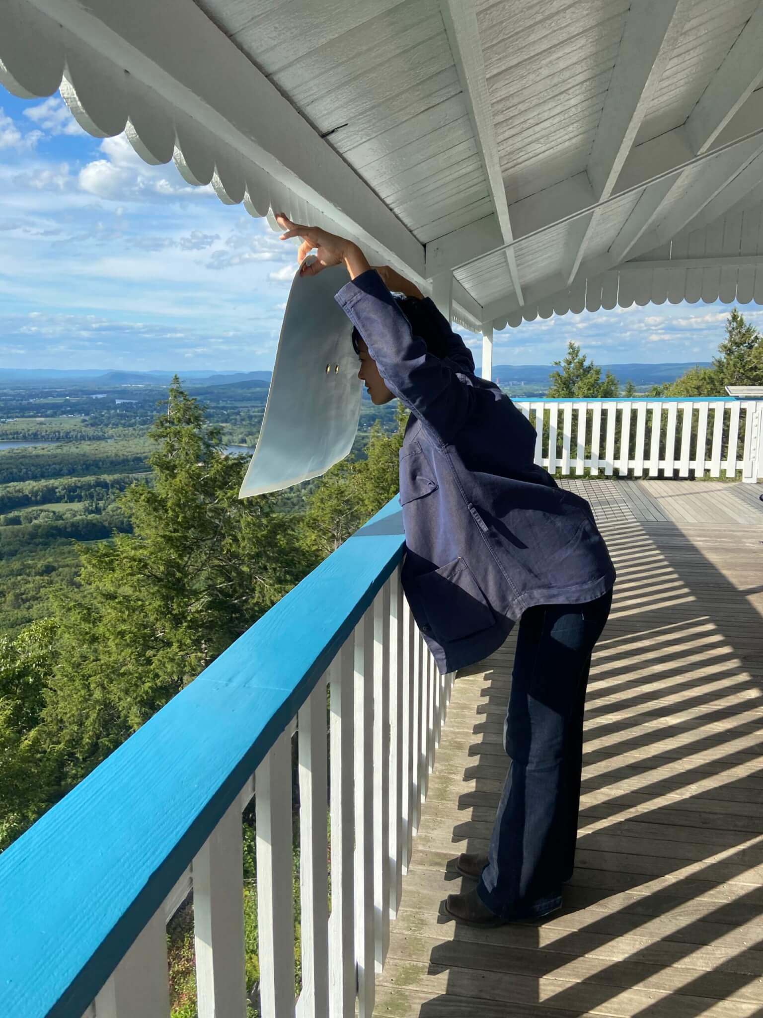 A viewer holds Autumn Ahn’s urban rain on the deck of the Prospect House