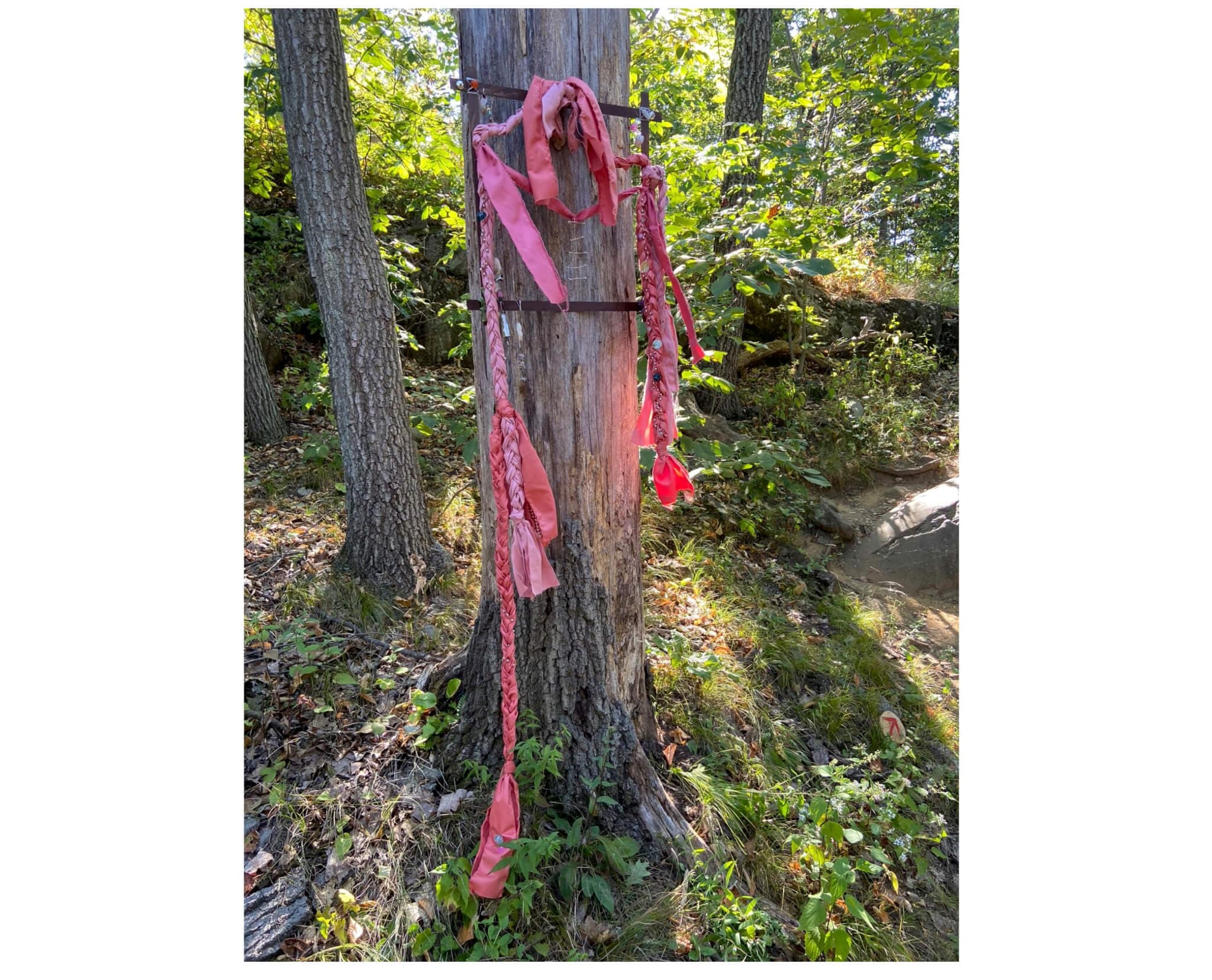 Sissy Williams, Charm, 2025. Cotton, silk, wood, glass, sterling silver, plastic, seashells. Installation view, “The Summit Show,” Skinner State Park, 2025. Photo by and courtesy of Charlotte and Emma Kohlmann.